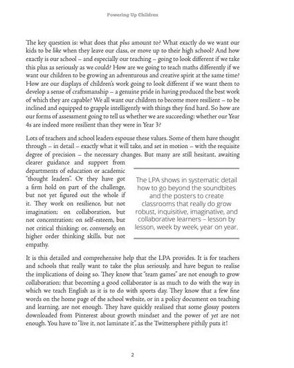 It offers a thorough explanation of how the LPA's design principles apply to this level of education and, by presenting a wide range of practical strategies and classroom examples, illustrates how they can be put into action with different age groups and in different curricular areas - especially relating to literacy and numeracy, but also in specific subjects such as science, history, art, and PE.