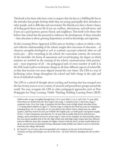 Illustrates in detail how school leaders can successfully embed the Learning Power Approach (LPA) in their schools culture and empower teachers to deliver its benefits to their students.