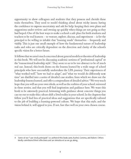 The school leaders job, therefore, is to provide direction and signal the standards aimed for in all these different aspects of school life and Powering Up Your School sets out a detailed explanation of how this can be accomplished. It distils into a series of illuminating case studies the lessons learned by a wide range of school principals who have successfully undertaken the LPA journey, and presents a variety of practical strategies geared to enable school leaders to make a positive impact on the lives of both their staff and their students.